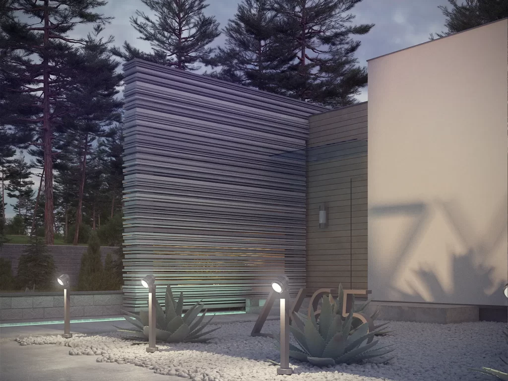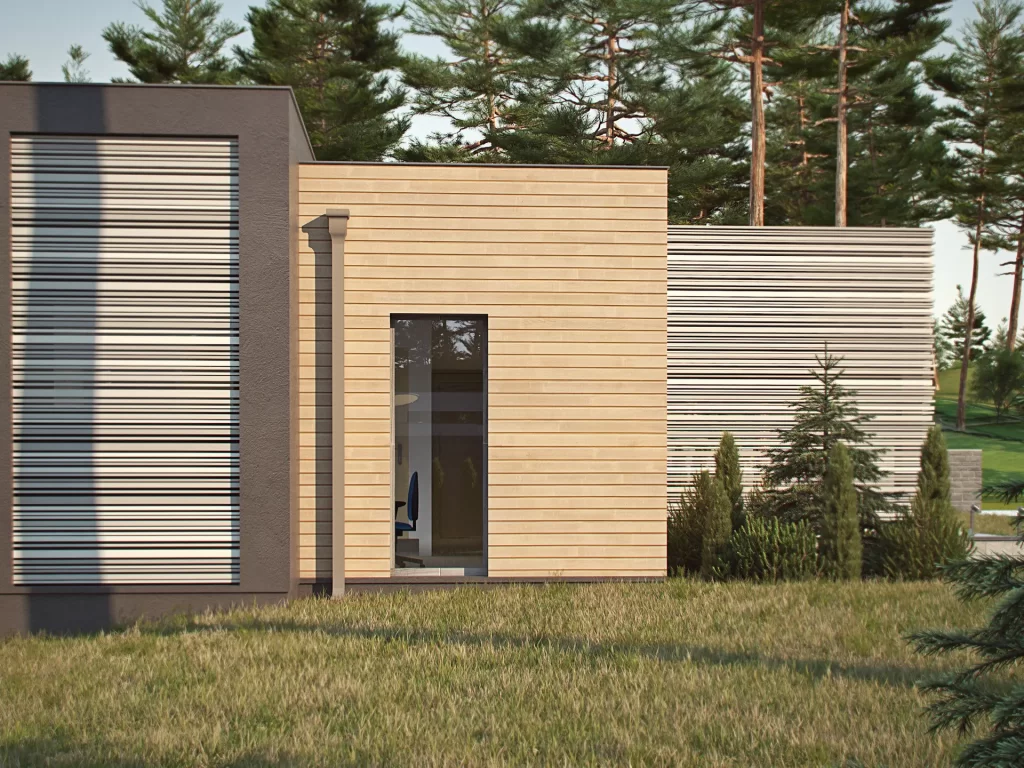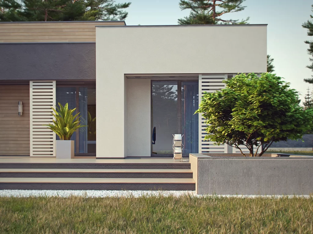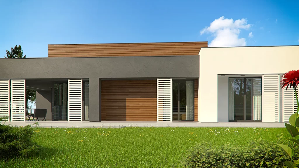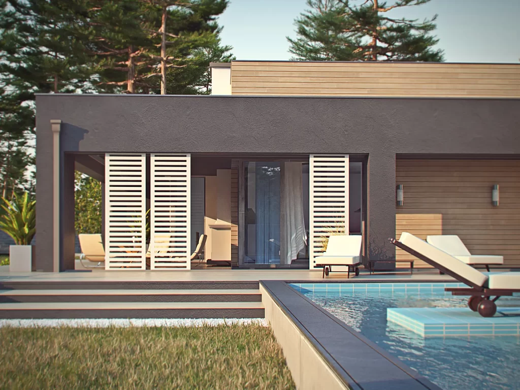 • Crisp lines and a bold architectural form, elegantly finished with white and gray plaster and natural wood cladding.