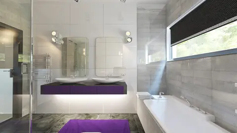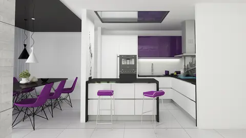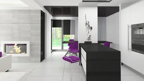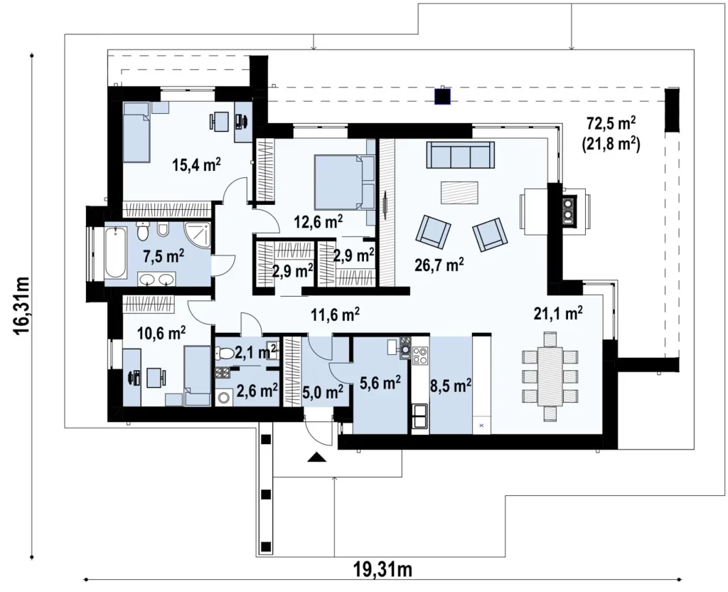 This home design features an expanded floor area with a flat roof and a bright, modern interior.