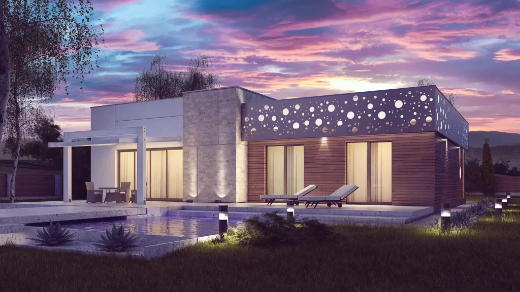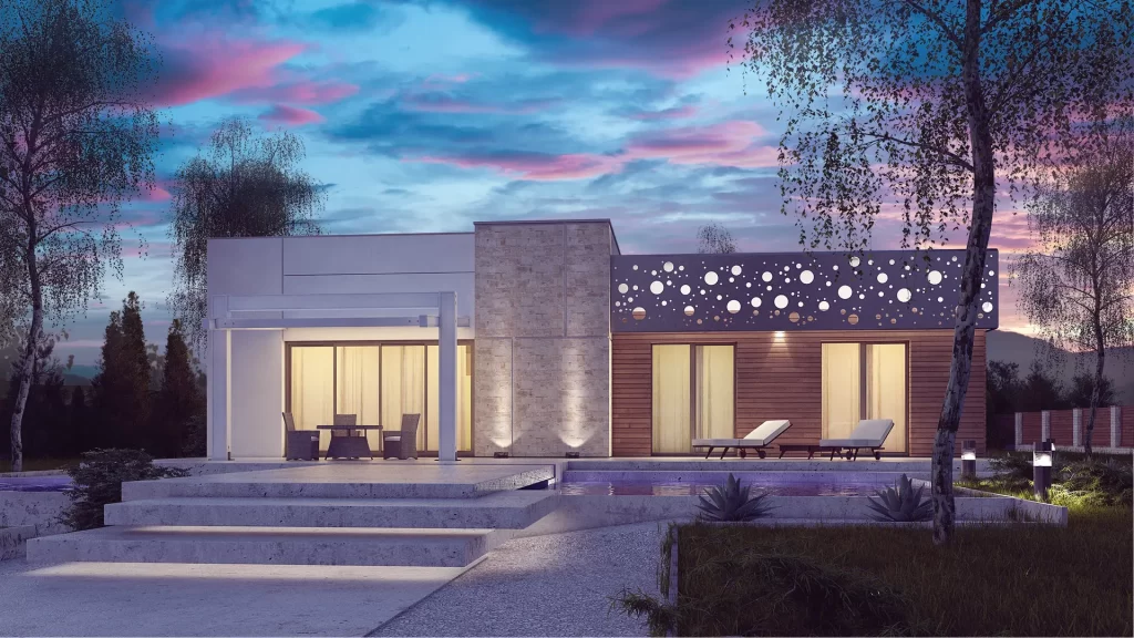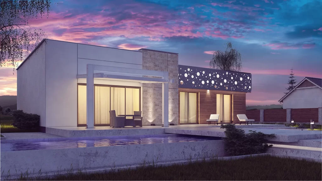 This is a stylish, single-story home with a flat roof, designed with clean lines and a simple cubic shape. The exterior is enhanced with an elegant ornamental design, combining white, gray-beige brick, and wood for a modern aesthetic.