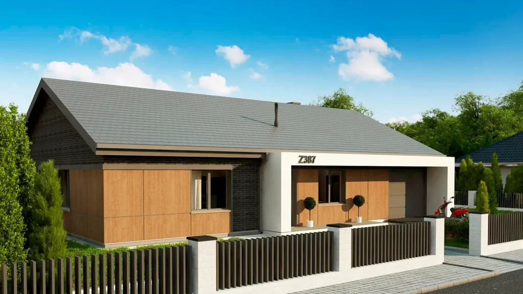 This project offers a single-story home with a brick-clad façade and modern design. The home features three bedrooms, two bathrooms, and a single-car garage, making it a functional choice for families.