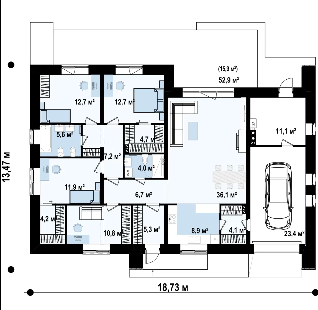 This project is ideal for those seeking a spacious, functional home with a single-level layout and thoughtfully designed spaces. It’s an excellent option for families looking for modern design and practical features.
