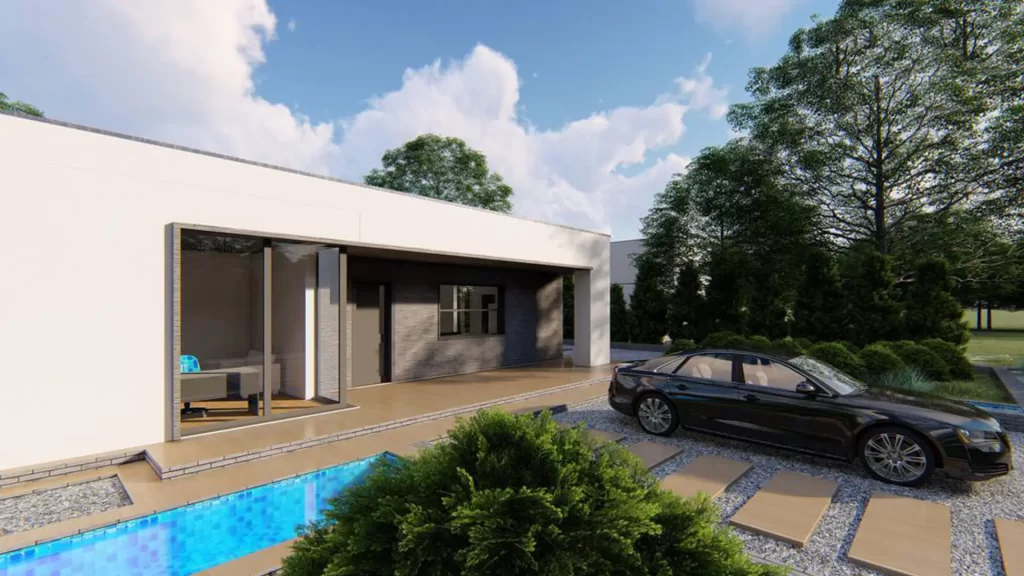 This is a modern single-story home with a flat roof and a clean, white facade.