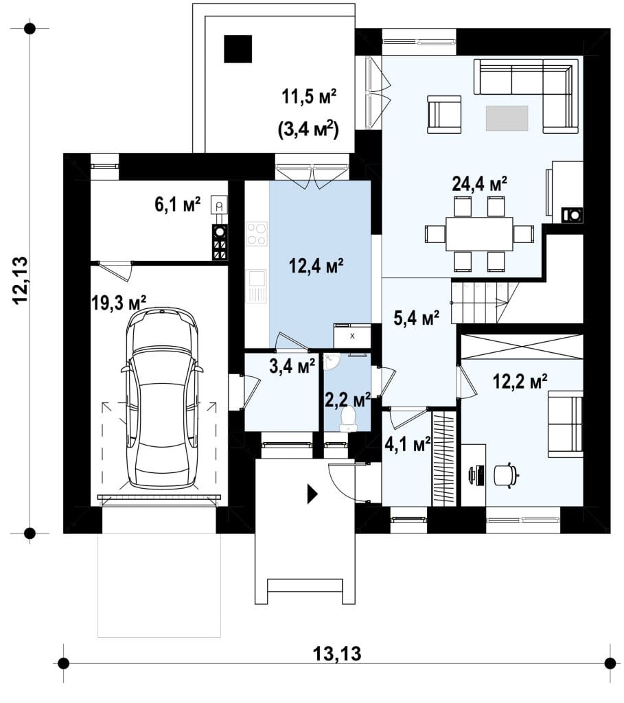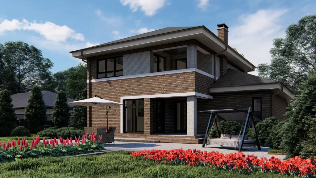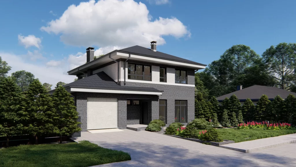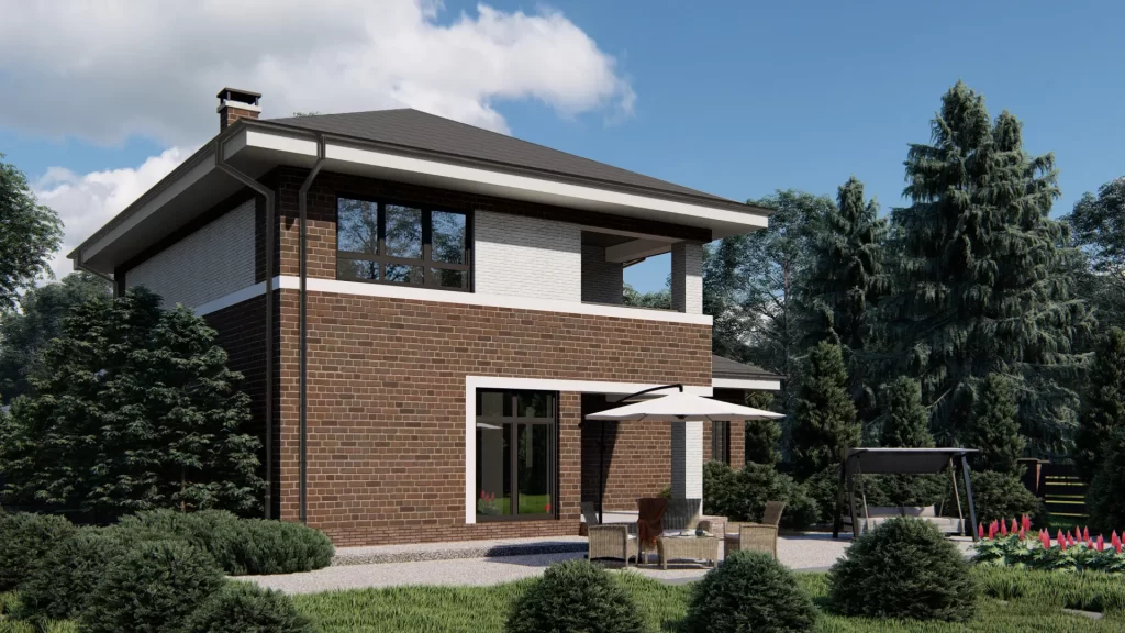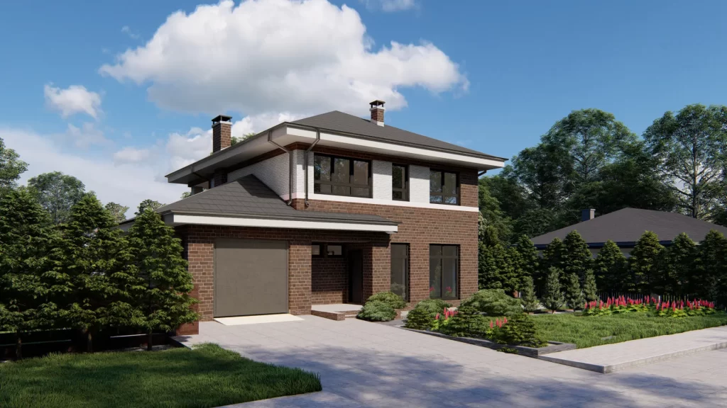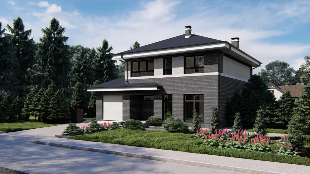 This two-story house project features a brick-finished facade and is designed to combine classic architecture with a modern, elegant color scheme. The balanced proportions and reserved exterior aesthetics make this home an attractive choice for homeowners of all ages.