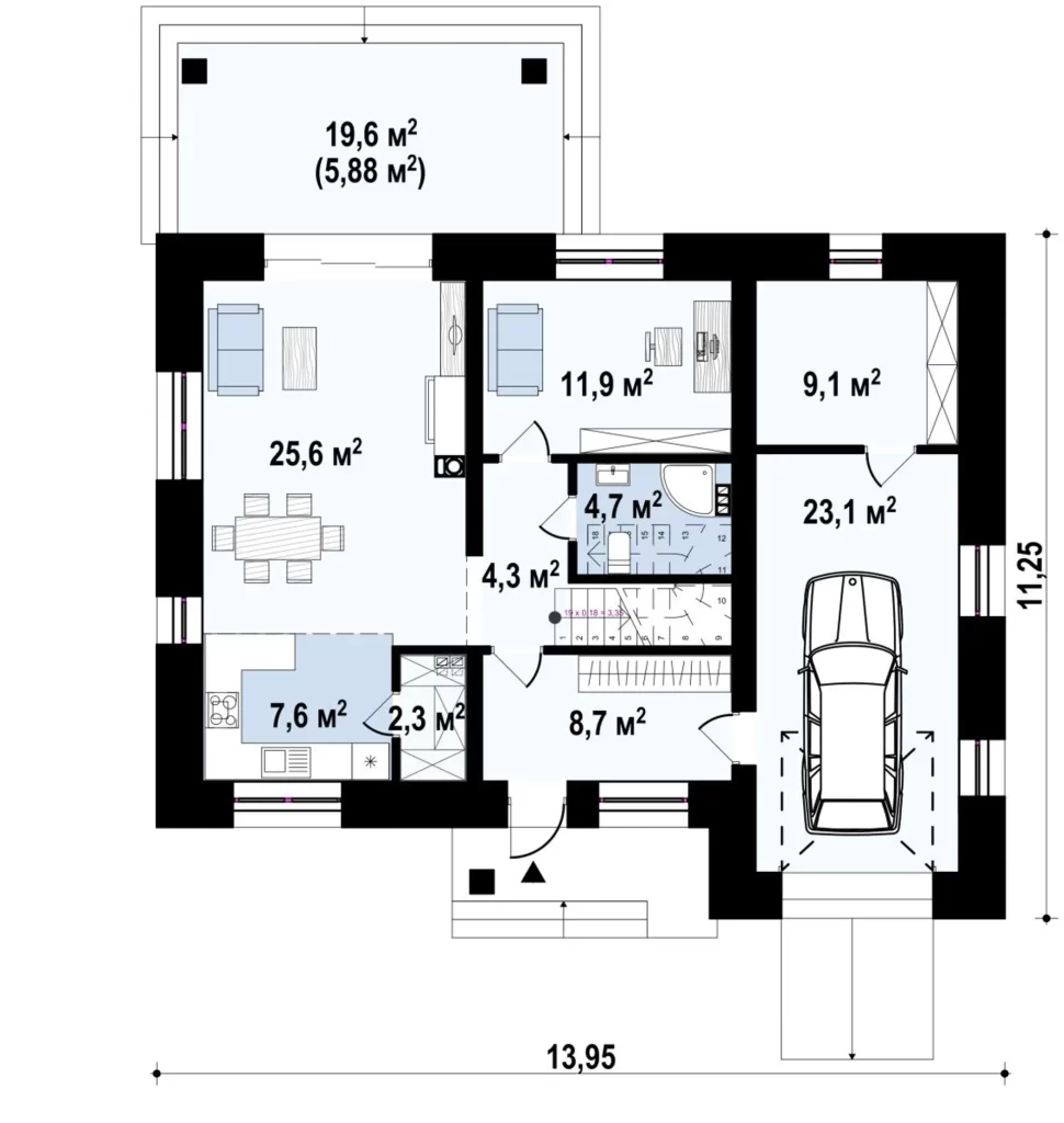 This home is perfect for families with two to three children. Its modern exterior design, simple building shape, and multi-pitched roof make it an excellent option for construction in a variety of locations.